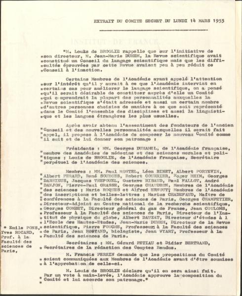 Le Comité consultatif du langage scientifique est fondé le 14 mars 1955 d'après une décision de l'Académie des sciences prise en comité secret. C'est d'abord une création de la Revue scientifique et de son président, Jean-Marie Duhem. Ce dernier avait constitué le Comité du langage scientifique avec plusieurs buts en tête : établir un langage scientifique français commun, normalisé, tout en participant à son rayonnement mondial. Ces missions seront également celles de l'Académie. Cependant les difficultés dont étaient victime la revue fragilisaient la régularité et l'autorité du Comité. De plus, certains membres de l'Académie avaient appeler à porter de l'intérêt au soin du langage scientifique. Il a donc été conclu entre le directeur de la revue et les membres de l'Académie des sciences que cette dernière patronnerait le Comité afin de supporter son projet.