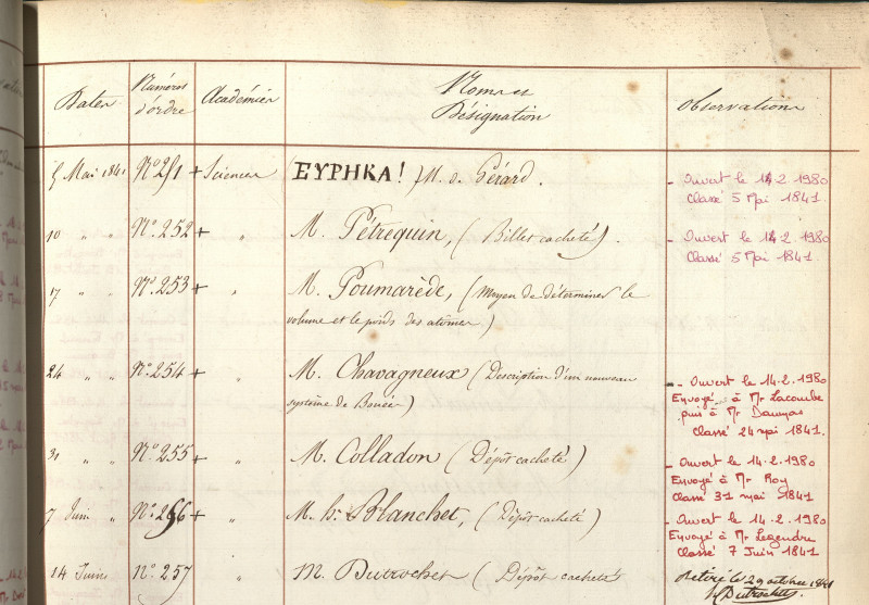 Certains documents, comme le pli déposé le 1er novembre 1772 par le chimiste Antoine Laurent de Lavoisier sur l'augmentation de poids des métaux lors de leur combustion, revêtent un intérêt historique considérable.